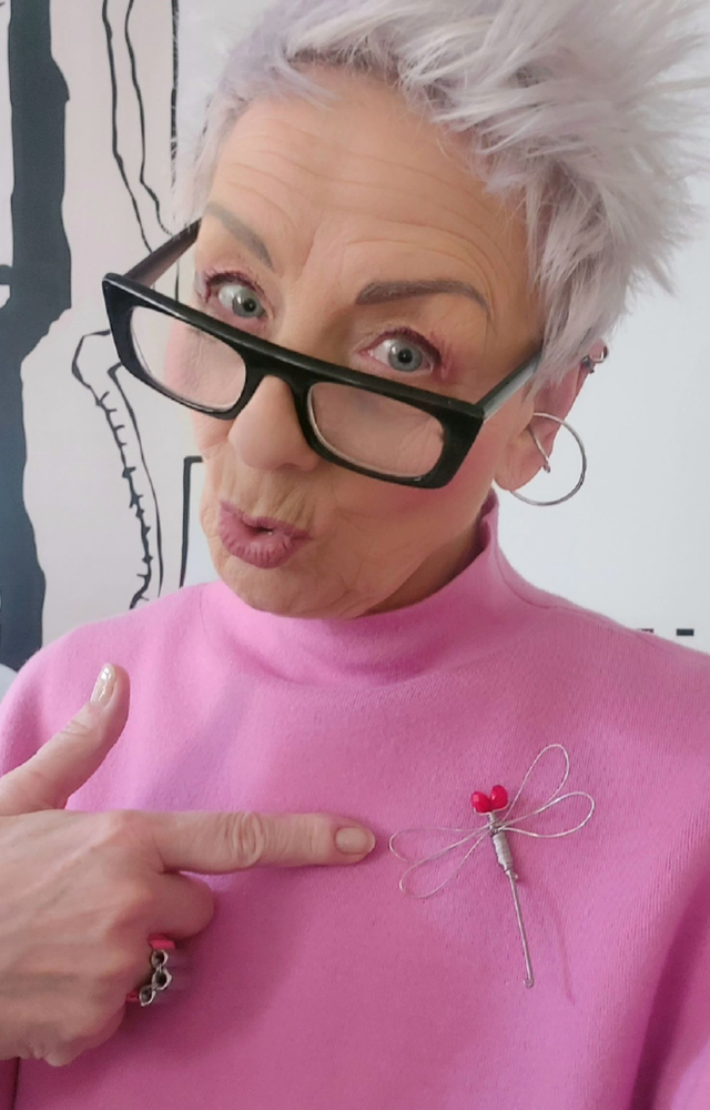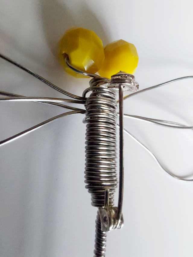 broche en fil d'inox et perles de verre facettées. fermoir avec sécurité. couleurs des yeux : bleu dur, vert kaki, rouge, transparent, gris, jaune fluo, noir [longueur env : 7 cm]