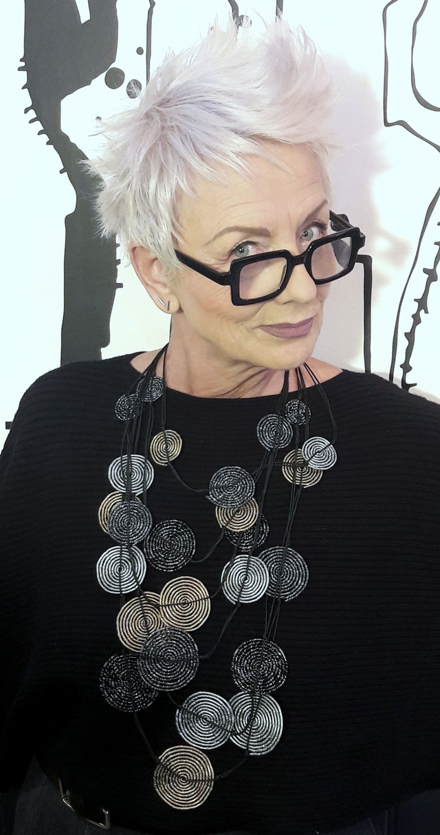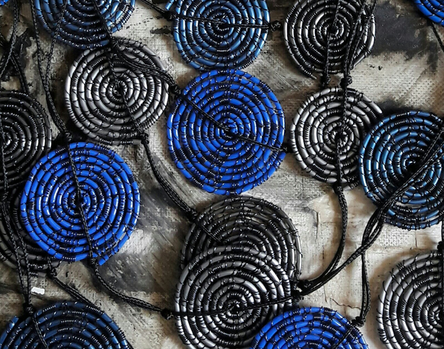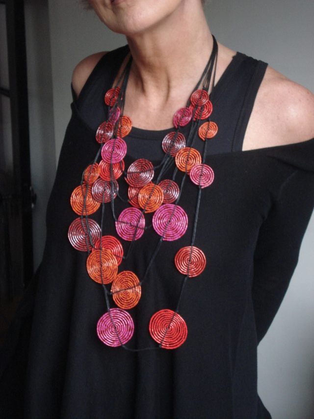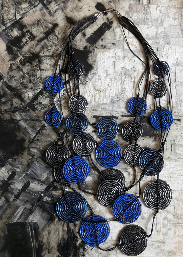 collier parure, composé de spirales de fil polymère et fil d'inox ou cuivre émaillé, tressées à la main et montées sur six rangs de cordon ciré